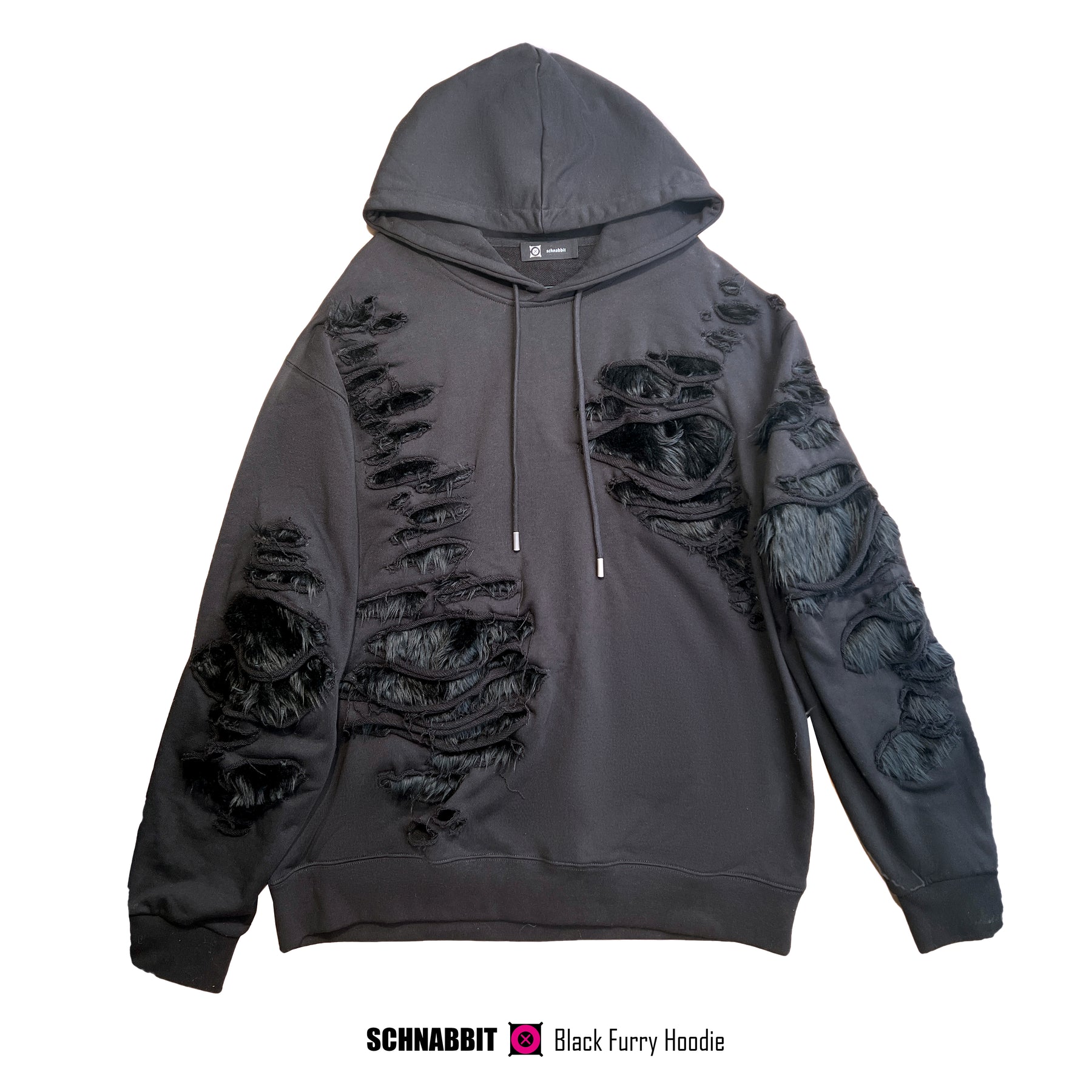 The Black Furry Hoodie by SCHNABBIT is an elevated take on cozy streetwear. Crafted from soft cotton with an oversized fit, this hoodie features unique faux fur patches layered within distressed sections across the chest, sleeves, and back, giving it an edgy, textured look. Perfect for making a statement with comfort and style.