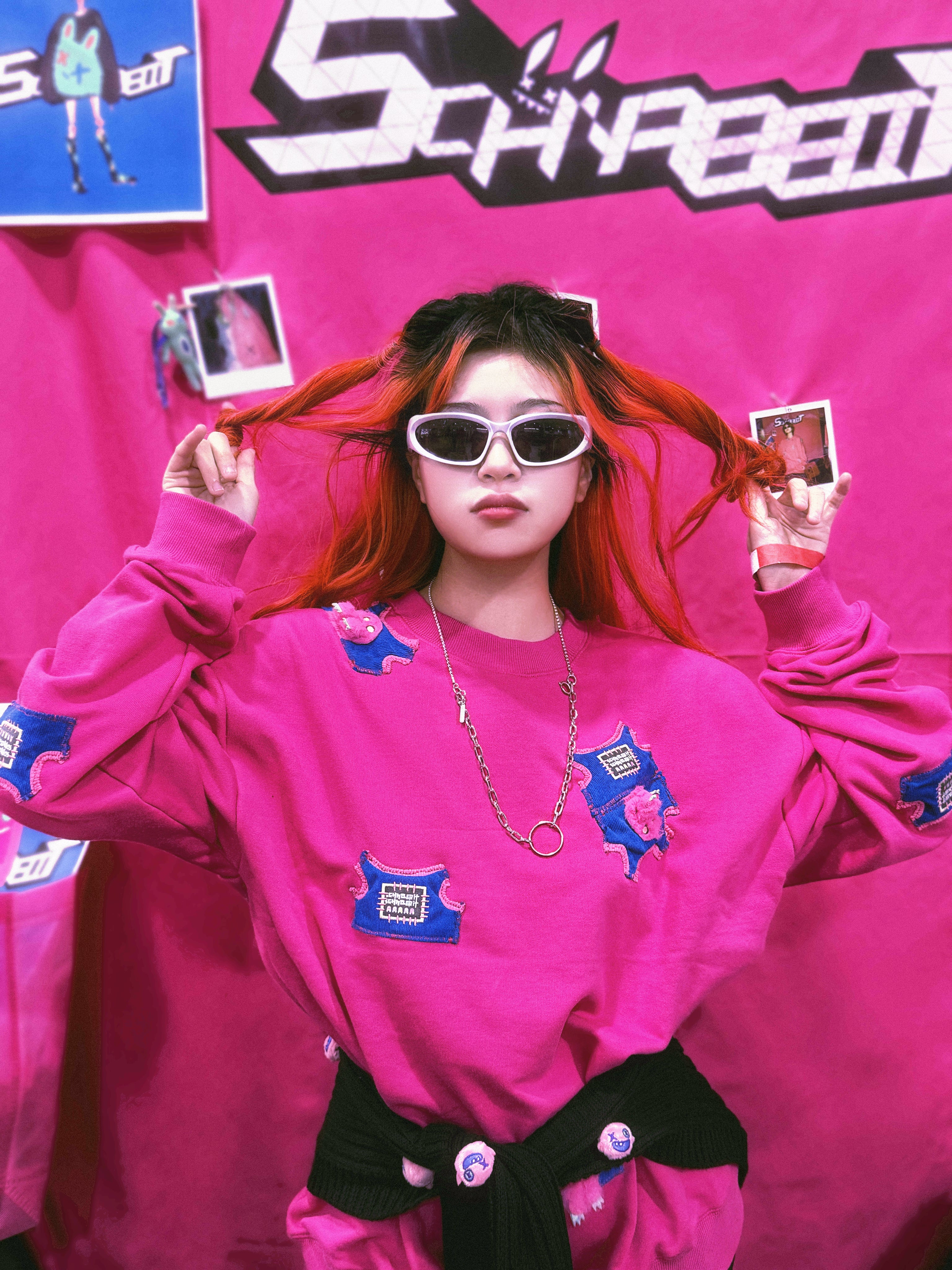 Elevate your wardrobe with our exclusive handcrafted rose pink crewneck sweatshirt. This distinctive piece features a collection of small vests seamlessly sewn onto the fabric, each adorned with vibrant patches or charming little monsters. The monsters come to life with three-dimensional, movable cotton-filled hands, adding a playful touch to your style.